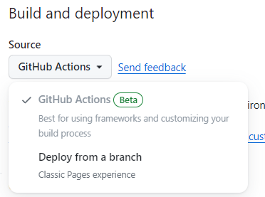 1. Settings > Pages > Build and deployment 설정을 GitHub Actions로 변경한다.